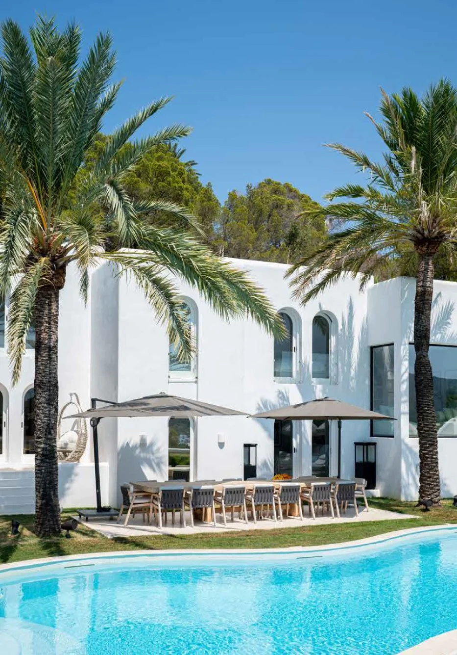 With seven elegant bedrooms, expansive terraces, a curved pool, rooftop Jacuzzi and panoramic sunset views, the villa combines contemporary design with relaxed Ibizan living.